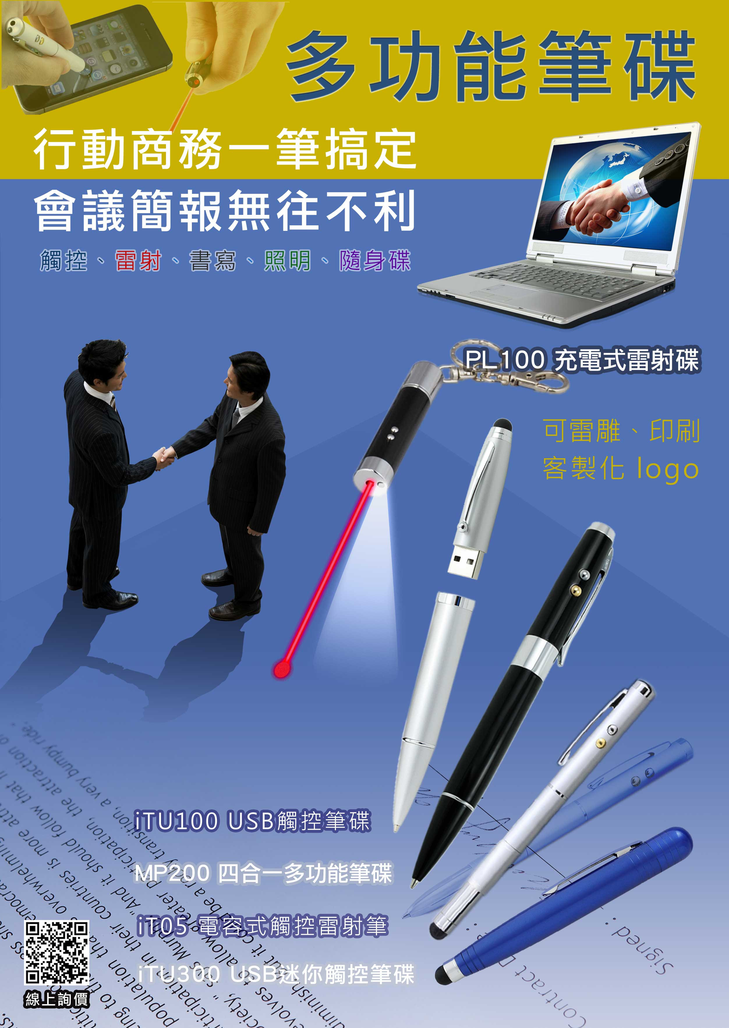 隨身碟、原子筆、紅光雷射、LED手電筒功能合為一體,可雷雕、