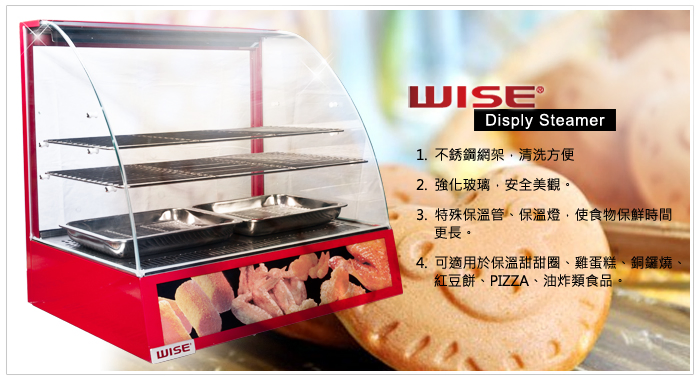不銹鋼網架,清洗方便強化玻璃,安全美觀。特殊保溫管、保溫燈,使食物保鮮時間更長。可適用於保溫甜甜圈、雞蛋糕、