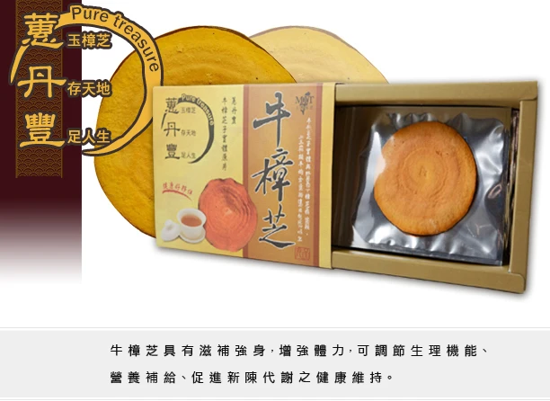 人工無菌培養牛樟芝子實體,含豐富三萜類成分,經qPCR即時基因定量系統檢驗本產品與野生牛樟芝之DNA為99.9%,可完全取代野生牛樟芝,非液態培養菌絲體(無三萜類)及太空包培養(易有雜菌感染之虞)可比擬,本產品生長全程均在無菌室中以純菌培養。牛樟芝具有滋補強身,增強體力,可調節生理機能、營養補給、促進新陳代謝之健康維持。