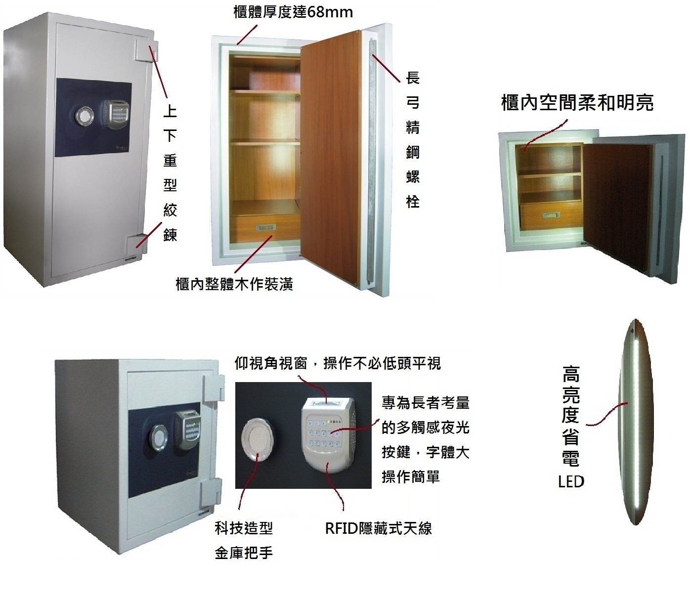 4. 櫃體設計: 櫃體牆壁總厚度達68mm(6.8公分)之抗破壞設計,內外鋼板包夾特殊 之防盜填充材料。 櫃內以組合式木作裝潢,兼具防潮防塵效果。並配備高亮度LED照明 ,存取物品再也不必提手電筒了。