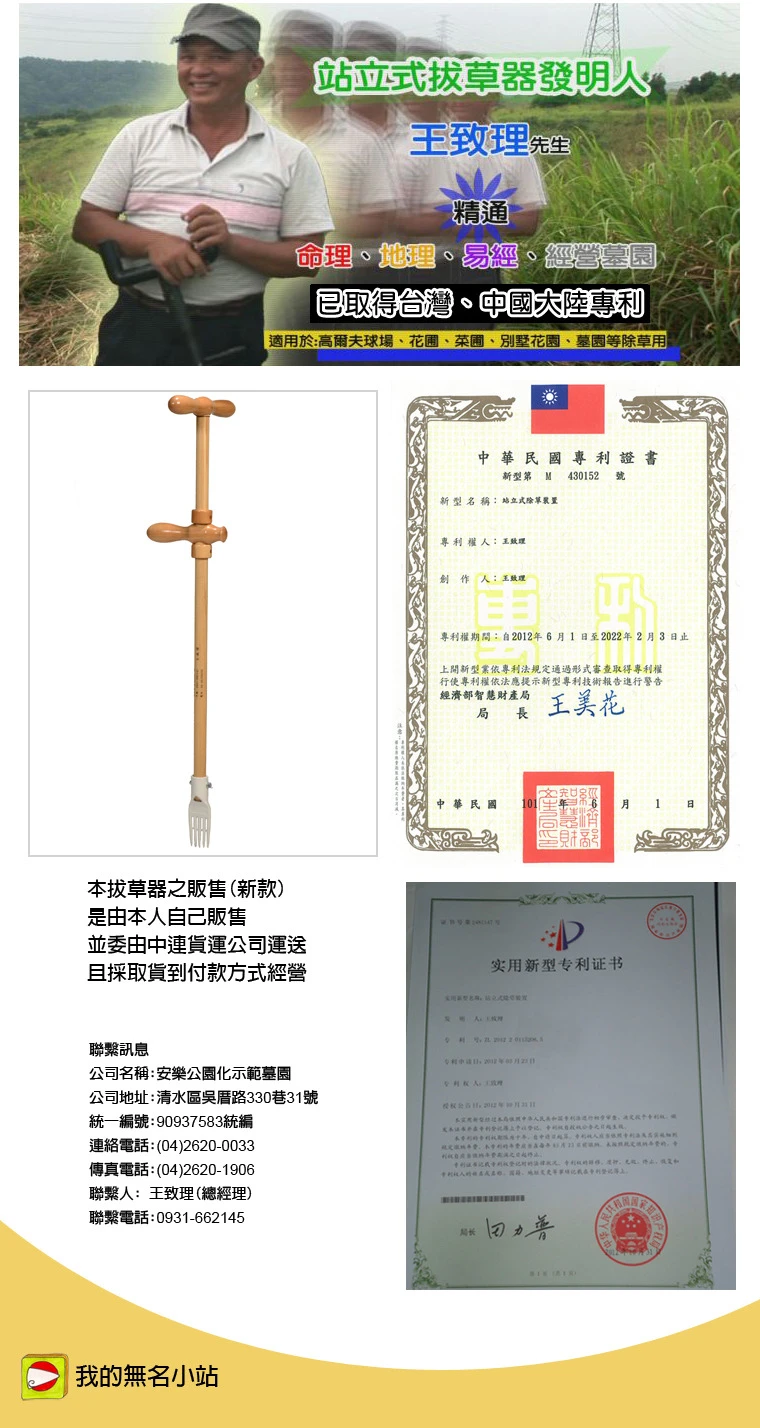 全球首支不用電的綠能環保除草工具,正式亮相,該產品取得經濟部發給為期10年的發明專利證書保障,新型證號為第M430152號,正式的名稱為「站立式除草裝置」(業者簡稱為站立式拔草器)。