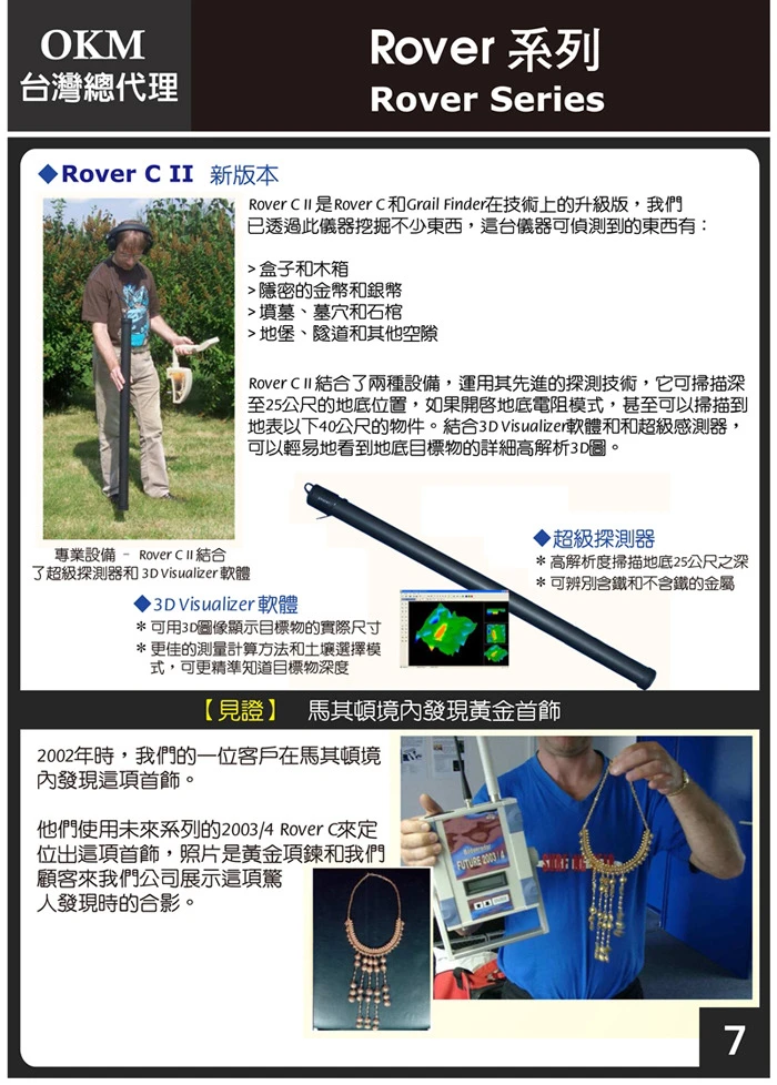 透過由德國「OKM定位技術」製造商所生產的地球物理探勘儀,你能找出地底下的物件,像是金、銀、寶箱、寶藏、文物、雕像、石板或是隱藏的空隙,像是隧道、墳墓、甚至是地底的水沉積物等等。使用我們特殊的高解析度多功能探測設備,你也可偵測到地底的古老建築、古代遺址、隱藏牆壁、文物、地下輸送管線、地下電纜和運河網。