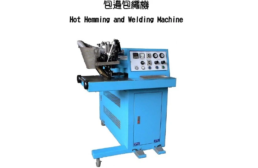 熱熔式包邊包繩機,適合PE,PP, PVC, 不織布等塑膠布類,最快可達每分鐘25碼(約23公尺)之焊速.