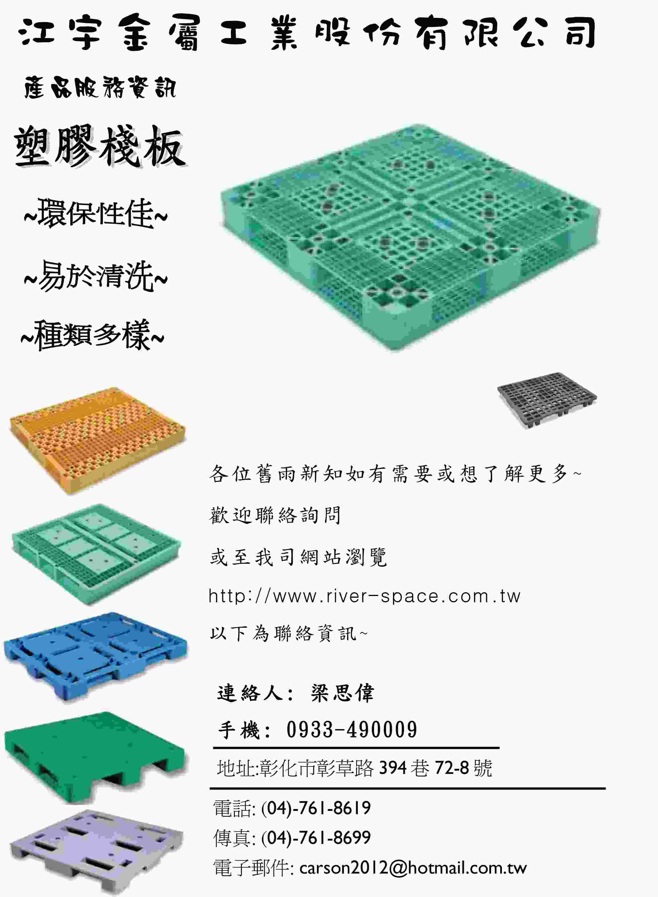 服務時間:營業項目: 外銷型鍍鋅棧板、場內循環使用鍍鋅棧板、塑膠棧板,可供客戶多樣選擇,歡迎詢價!!