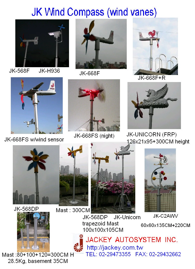 JK風向機由本公司設計、製造,高科技廠商如台塑集團、中國鋼鐵、聯電、生物科技、國防部、竹科、南科;國中小學、自來水廠、發電廠、焚化爐廠、農牧場、住家、遊樂區等均有採用,尤其高科技廠商用以取代原先使用的風向袋。JK風向機已取得智慧財產局發明專利;外銷方面取得U.S.A.發明專利20年,意者請洽詢。
